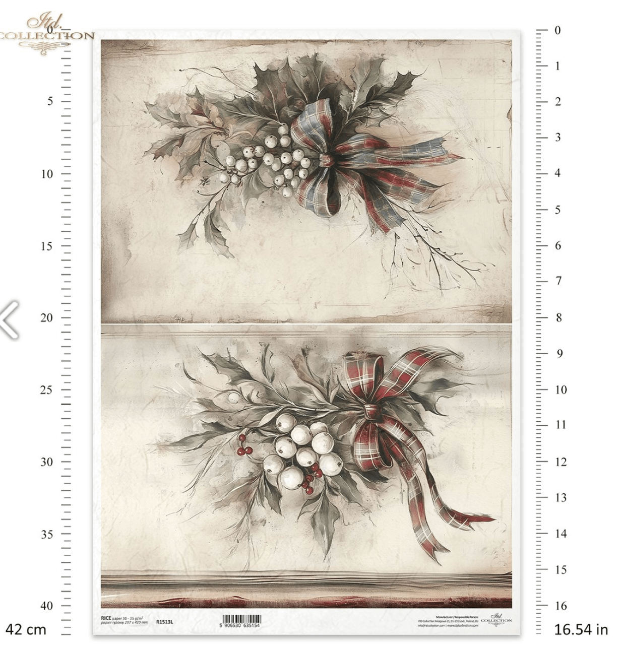 A3 ITD RED Ribbon Holly & Mistletoe Decoupage Paper R1513L
