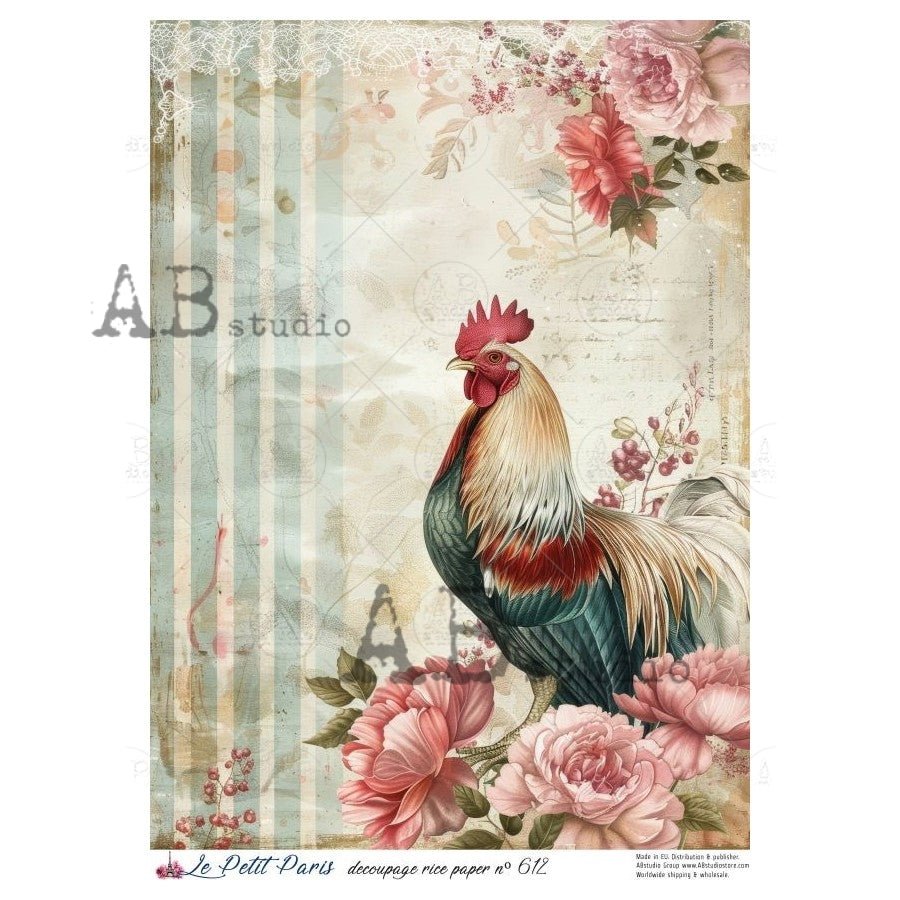 A4 LPP 612 Floral Rooster in Pastel Stripes Rice Paper