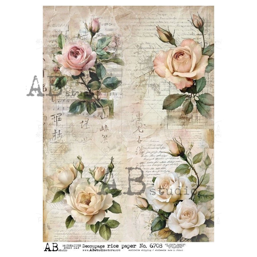Antique sheet music, script, and Asian calligraphy weave behind a quartet of delicate blush and ivory roses in this rich and vintage-inspired design. A timeless floral medley with classical vibes.