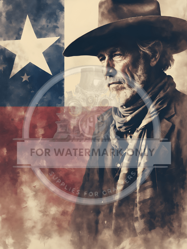 A weathered cowboy framed by the Texas flag — bold, gritty, and deeply American.