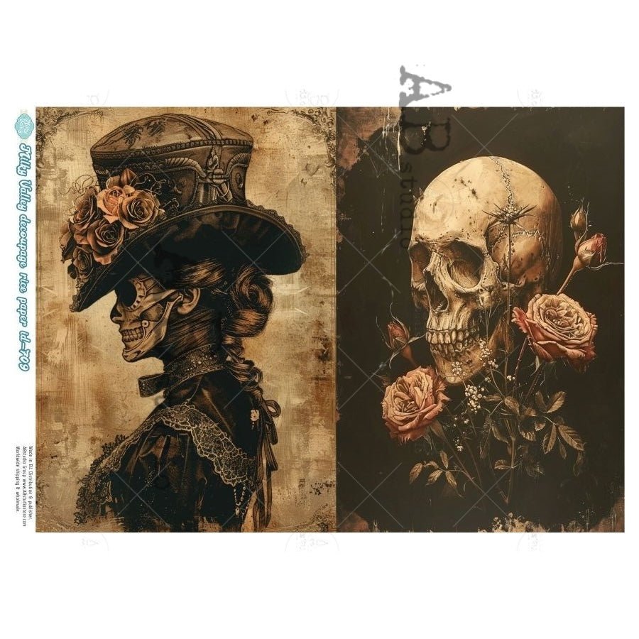 Intricate dark florals, antique skulls, owls, and Victorian silhouettes
