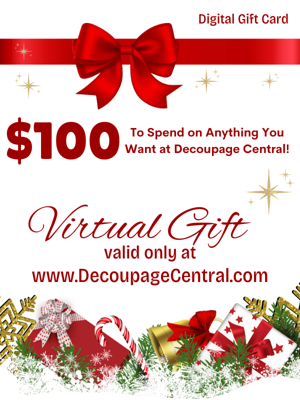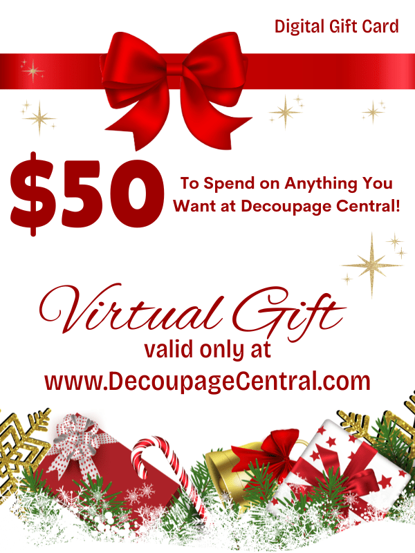Let your favorite crafter choose their favorites with a gift card from Decoupage Central. This is a virtual gift card to print and gift this holiday season. Your Crafter will have a code to enter at checkout. There is no expiration on the gift or the fun they will have with all of their new craft supplies from DecoupageCentral.com.