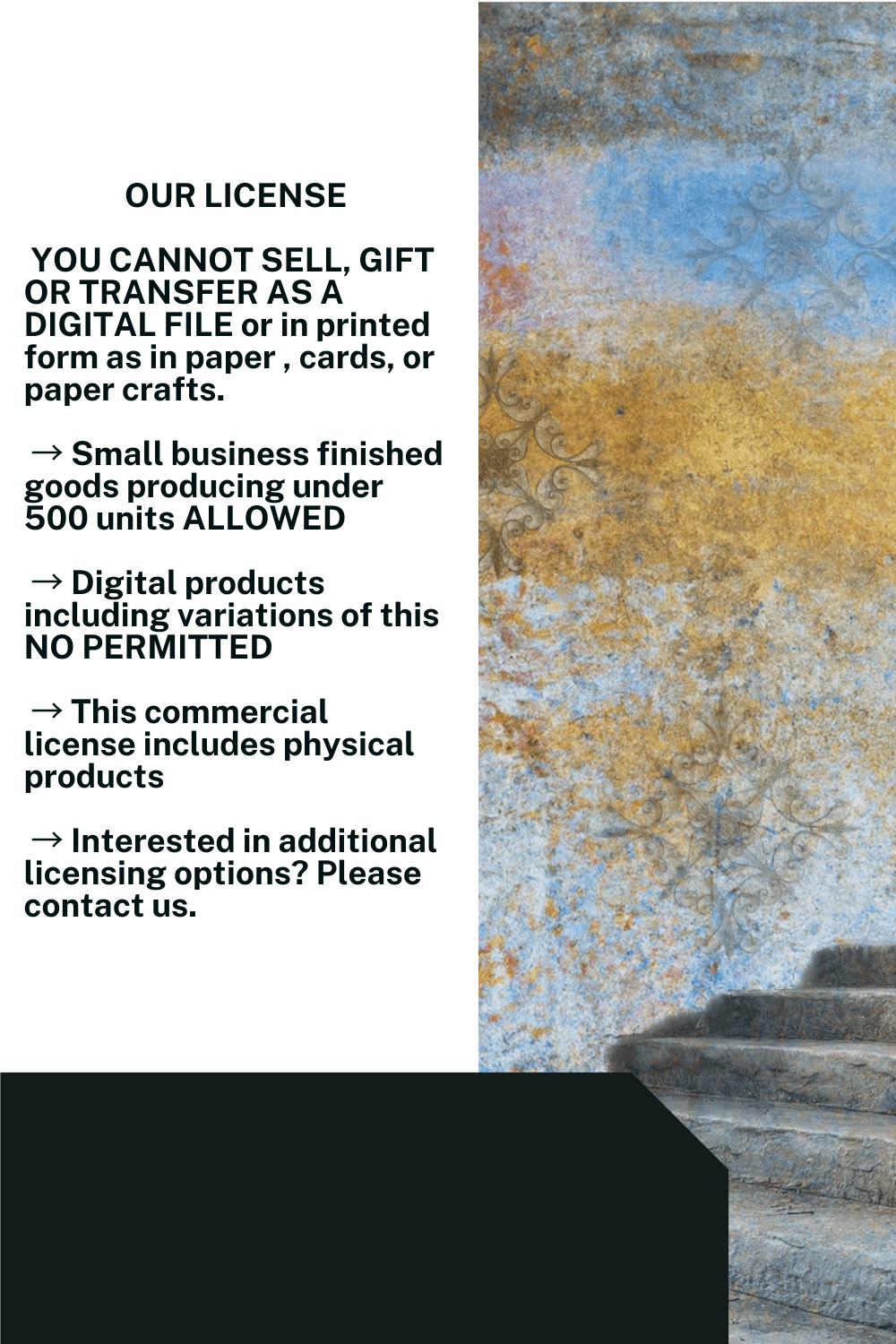 This license applies to physical products only. Your purchase does not allow this or any image purchased here to be sold or distributed in a digital form. You may not reproduce, alter, or redistribute it as a digital item or use these images to create your own digital designs.