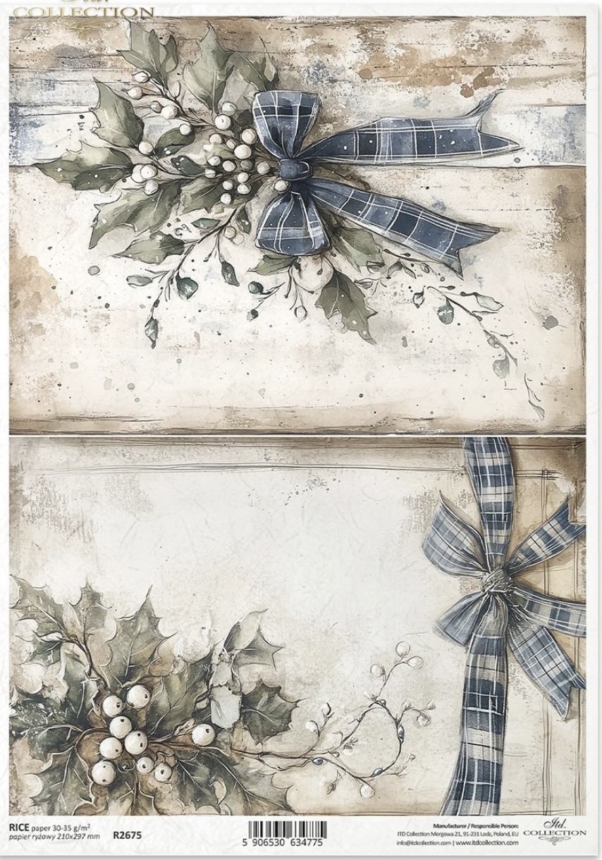 Soft, snowy elegance meets cozy countryside style in Winter Wishes in Blue. This rice paper features icy holly, mistletoe, and powdery-blue plaid ribbons on a weathered backdrop. Ideal for winter-themed journals, seasonal signs, or frosty Christmas cards that stand out with subtle sophistication.